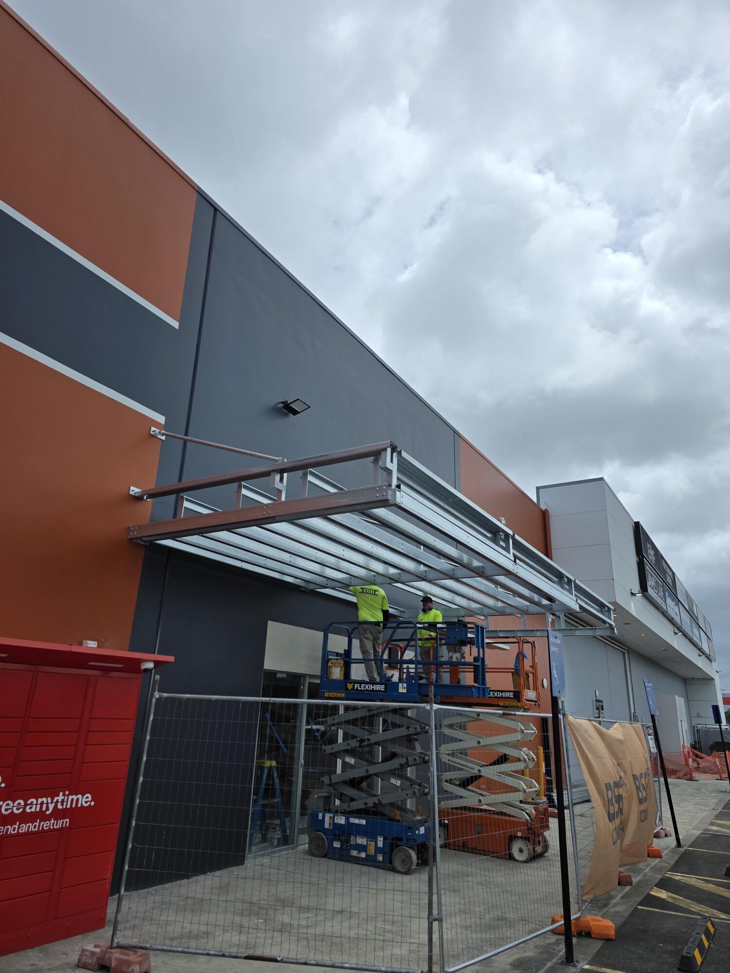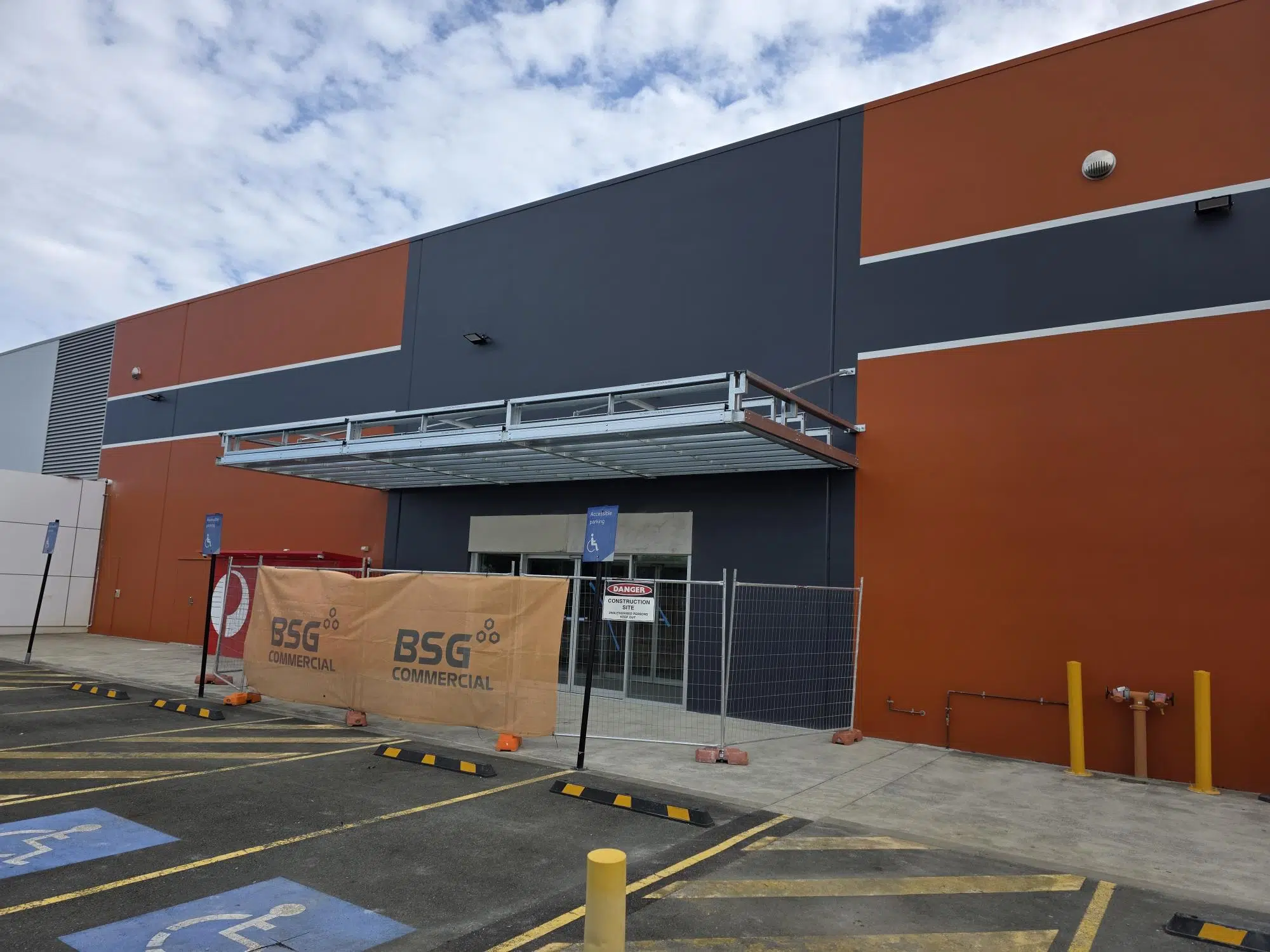 BSG’s scope covered structural modifications to the existing concrete façade, construction of the new shopfront portal and awning, inter‑tenancy walls, façade repainting, and base‑build lighting and power. All work was delivered while neighbouring retailers traded and a 24‑hour gym operated directly adjacent to the site.